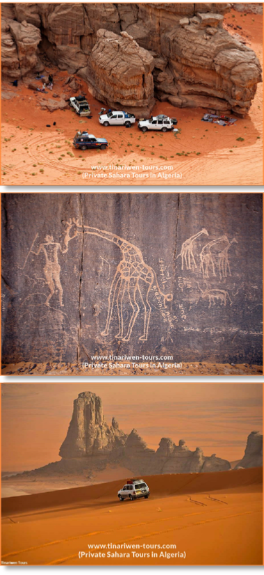 We offer Sahara tours in Algeria available every day , with private and comfortable 4x4 transfer. Our Algeria travel with Tinariwen Tours is an authentic experience. Departure from Paris to Djanet. On arrival, you are greeted at the airport and you go for your first bivouac on the road towards the Tadrart (15 min from the airport). Your camp is set up and waiting for you.